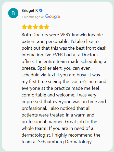 Patients from Hoffman Estates as well as nearby areas like Schaumburg, Palatine, and Streamwood often look for a dermatology provider who is both convenient and experienced. Our goal is to make high-quality dermatology care easily accessible to patients throughout the area, with flexible appointments and a straightforward approach to treatment. Whether you are coming in for a specific concern or simply want to stay proactive about your skin health, working with a trusted dermatologist near Hoffman Estates ensures you have a reliable place to go whenever you need care.